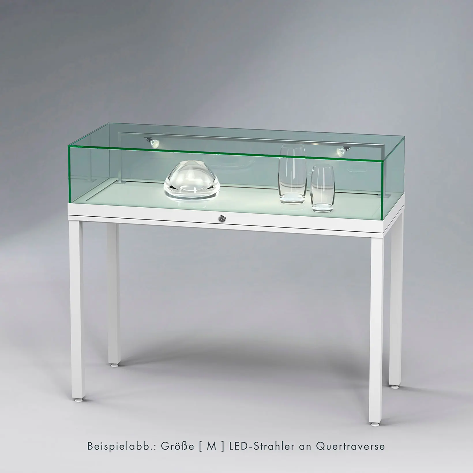 Tischvitrine Ganzglas mit Standbeinen -  Design-Vitrine für Museen, Ausstellungen oder das exklusive BüroRahmenlose Ganzglas-Konstruktion mit 8mm ESG-Sicherheitsglas Größen B/H/T1000 × 970 × 500 mm1200 × 970 × 500 mm1400 × 970 × 500 mmHöhe des Glaskorpus 220 mm Öffnung - Glaskorpus aufklappbar mit seitlichen Gasdrucköffnern,die den Aufbau arretierenVerglasung - Einscheiben-Sicherheitsglas / ESGOberfläche - RAL-9010, Reinweiß oder RAL-9005, Tiefschwarz - RAL-Classic Farbtöne nach WunschBeleuchtung - ohne Beleuchtung - optional: waagerechte Strahlerschiene mit LED-Strahlern, inkl. TrafoSchließung - Sicherheitsschloss mit 2 Schlüsseln